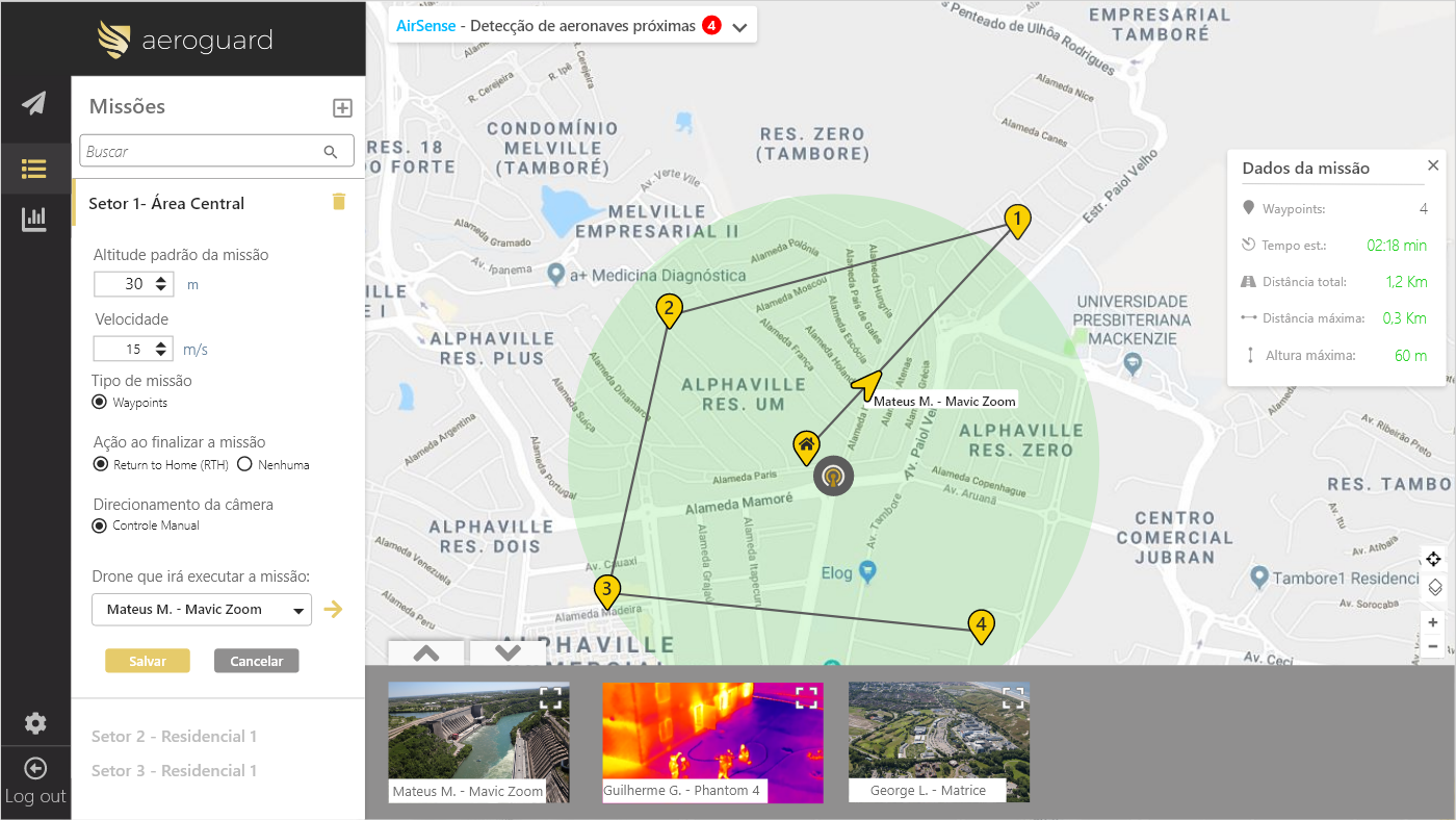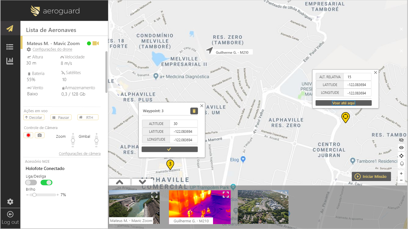- Durante o voo, permite a definição de posições precisas dos trajetos, altitudes e tempos de permanência em cada ponto demarcado, envio de imagens coletadas direto para o seu servidor Digifort, também o armazenamento local das gravações e registro das ações do operador, tanto para fins de auditoria quanto para analisar as situações de risco de voo, não às cumprindo quando for o caso e interrompendo a navegação.
